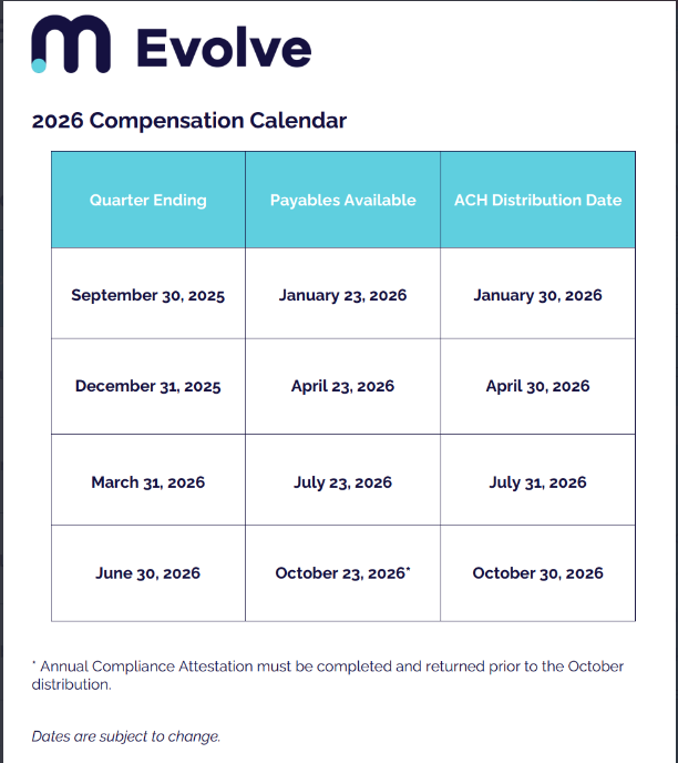 This is the static compensation schedule for Evolve clients. Please see further below for the 2026 Compensation Calendar.